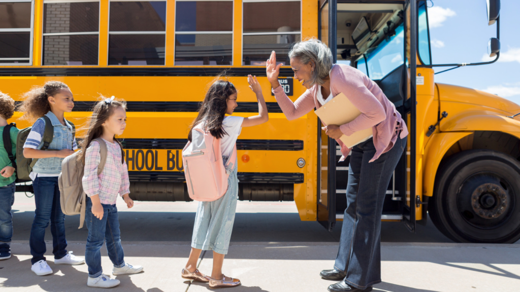 Adding positive reinforcement through high-fives, or social praise, can help children learn behaviors such as lining up to wait for the bus.